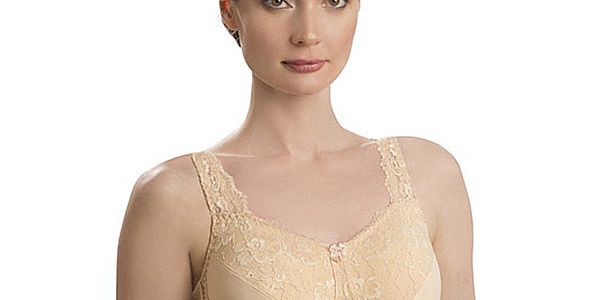 Бюстгальтер ортопедический из трикотажного полотна и кружева. Обхват регулируется многоуровневой застёжкой сзади. Специальный кармашек из хлопка для протеза (с тремя открытыми швами) находится с обеих сторон. Широкие бретели, украшенные кружевом, снимают напряжение с плеч и шеи. Высокая линия декольте и расширенный пояс скрывают следы оперативного вмешательства.