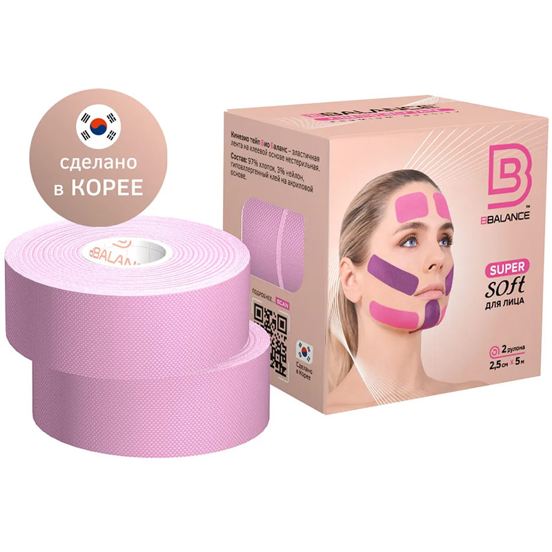 Кинезио тейп Bio Balance Tape Super Soft для лица 2,5см х 5м сакура BBTAPE ОписаниеПроизводятся в Южной Корее. Тейпы Super Soft созданы специально для ночного тейпирования.В упаковке два рулона Благодаря свойствам материала и клея тейпы для лица обладают следующим преимуществом:лучше накладывается тейп на тейп, что позволяет накладывать сложные аппликации;мягкое удаление тейпа с кожи после использования, без использования дополнительных средств;плотное прилегание к коже во время сна.Особенности материала BB Super Soft Производятся из натурального мерсеризованного хлопка, не содержат латекса. Благодаря чему обладают высокой воздухопроницаемостью, гипоаллергенны, прочные и одновременно мягкие, кожа под тейпом свободно дышит и не раздражается. Клей устойчив к воде, вы можете спокойно мыть тейпированные участки - тейп не отклеится. Тейпы Bio Balance эластичны так же как и кожа, волнообразная структура клеевой поверхности приподнимает кожный покров, снижая его давление на поврежденные участки. В тейпированных участках улучшается крово- и лимфоток. Тейпы линейки Super Soft идеально подходят для ежедневного применения.Использование тейпов BB Super SoftСнятие отековЛимфодренаж и улучшение кровоснабженияУменьшение морщин и заломов на кожеПодтяжка лица tol /upload/iblock/e42/e4224ddae55687d3de490da93c660835.jpg
