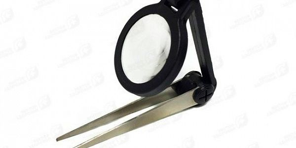 Это увеличительная лупа для точных работ. Лупа имеет корпус, выполненный из черного матового пластика и пинцет для захвата мелких предметов.
